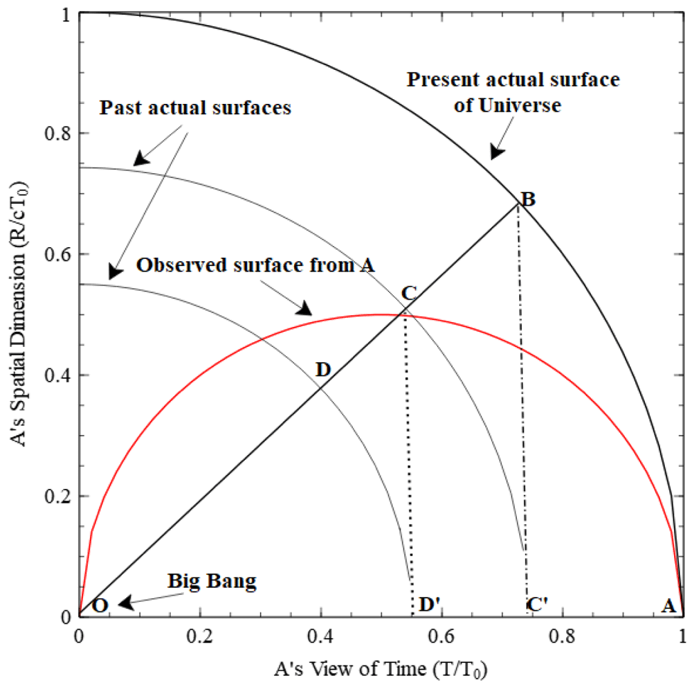 In Figure 4, the observable surface is OCA (red line). In this figure angle DOD′ = ζ gives the relationships sinζ = v/c = BC′/OB = CD′/OC. As already defined in this figure cT = OD′ and cT0 = OB. Let cT1 = OC′ and remember that with the actual surfaces OB = OA; OC = OC′; and OD = OD′.