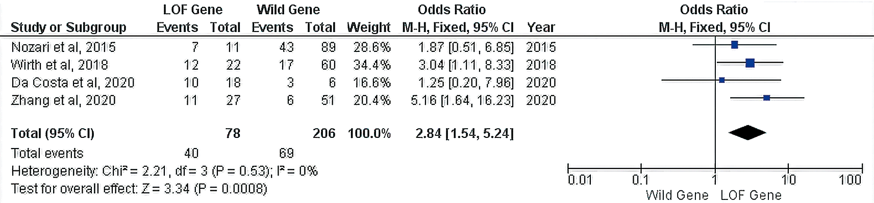 In most of the studies examined, the wild gene (*1*1) was dominant (in 65%–89% of patients) (Table 2). Only in the study by Da Costa et al. was the wild gene the minority (in only 25% of patients).7 The four selected studies examined different LOF genes. The study by Nozari et al. showed the heterozygote *1*2 LOF gene.10 In contrast, the study by Da Costa et al. examined LOF heterozygote *1*2 and homozygote *2*2 genes without clearly specifying the percentage.7 The study by Zhang et al. only mentioned that the LOF gene has a *2 or *3 allele.8 The study by Wirth et al. stated that the LOF gene has a *2 allele.9