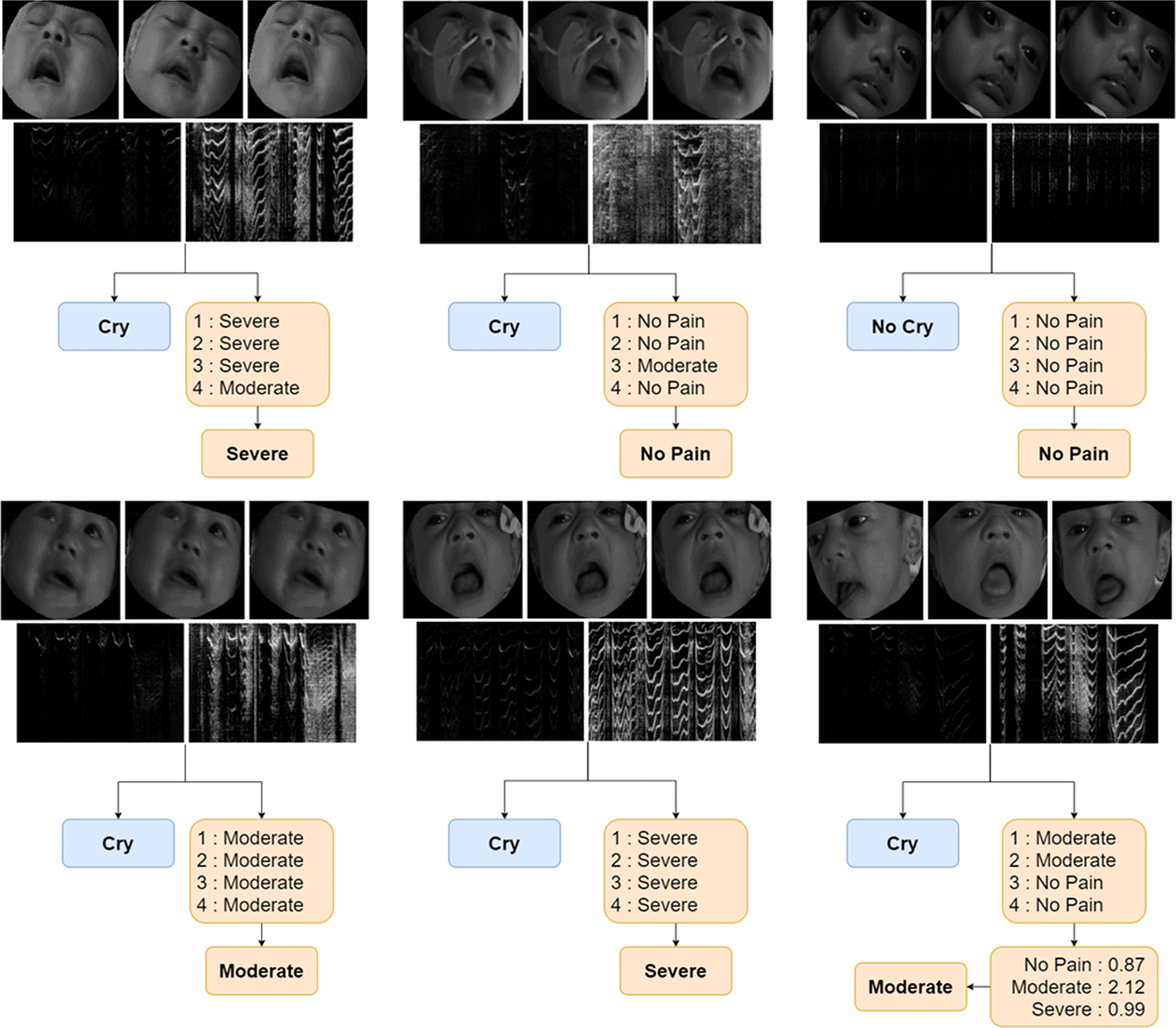 This study presents one model that was the best for the cry detection system. However, as a significant high F1 score for the pain classifier model could not be achieved, four models that provided a significant high F1 score were used instead. Each model had different parameters: face + dB-Scaled, face + amplitude, only dB-scaled, and only amplitude. From these results, it was decided to use all the models rather than choosing the best models. The prediction of the pain class was by using four models, and the majority votes method as the ensembling method was used. This method voted for all classifier results and used the majority class label as the final predicted class. In the case of tied votes, the class with higher pain labels were chosen. For example, if the severe pain and moderate pain classes had the same voting points, severe pain as the final prediction was selected.