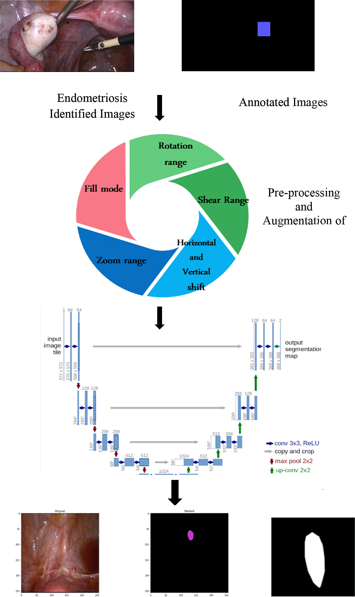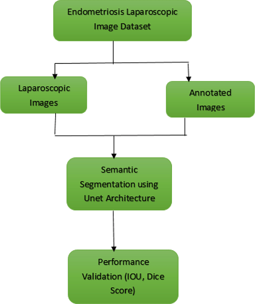 The semantic segmentation process ascertains the spread of endometriosis at multiple locations identified from pathologically proven images and mapped with annotated images. U-Net is a state-of-art technique for semantic segmentation to identify the images based on pixel classification.32 Semantic segmentation is a cutting-edge technology for recognizing the exact location of biomedical images. The steps involved in segmenting the laparoscopic images were as follows: