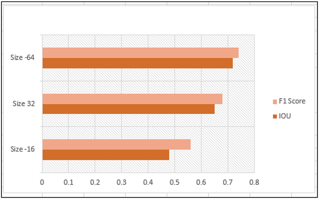 The empirical analysis was performed to identify the hyper parameters for segmenting the exact location. Based on analysis, the Adam optimizer performs well for overlapping regions based on the performance of intersection over union. The next parameter was the loss function. The loss functions used in U-Net architectures are cross-entropy loss, focal loss, and IoU Loss.42 Cross-entropy performs well based on the overlapping region. The sizes of the epochs were 10, 20 and 30. It was identified that intersection over Union was obtained when the epoch size was 20. When the epoch size was 10, the performance of the IOU was not up to the level, whereas when the epoch size was 30, outliers were found to be detected.