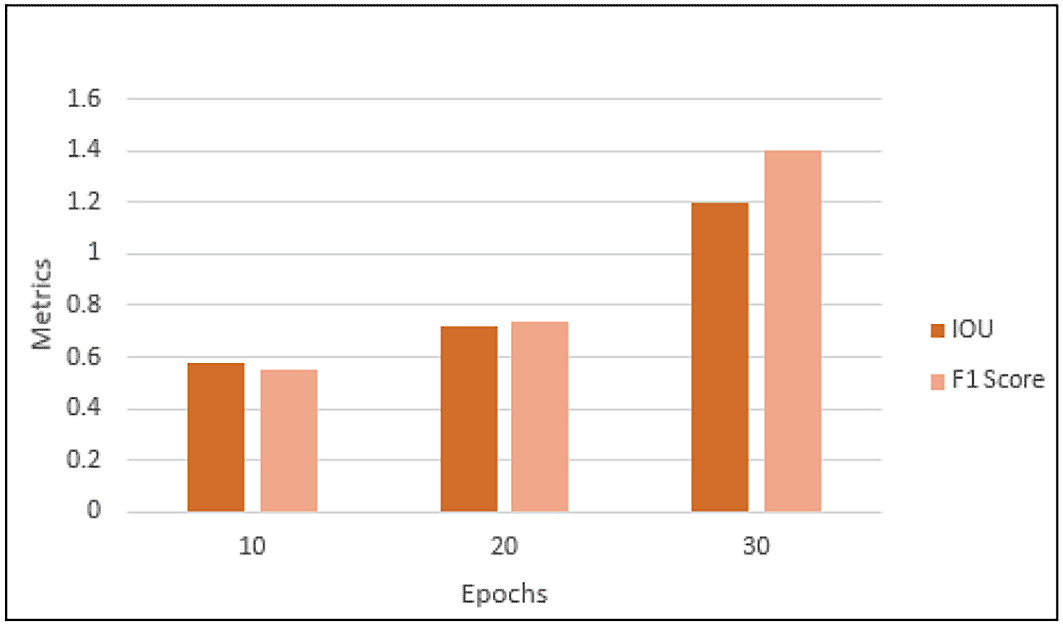 An epoch trains the data with the specified parameters with forward and backward passes. An epoch improves the quality of the metrics. In the given model, epoch size was determined based on the metric value obtained at the end of each pass. Initially 10 epochs were used where the model obtained an IOU of 0.58, F1 Score of 0.55. To fine tune the parameters, the epoch size was increased to 20 where the IOU was 0.72 and the F1 Score was 0.74. Finally, epoch size was tuned to 30, leading to overfitting. The epoch size of 20 outperformed well for the given model and all comparisons are illustrated in Figure 6.