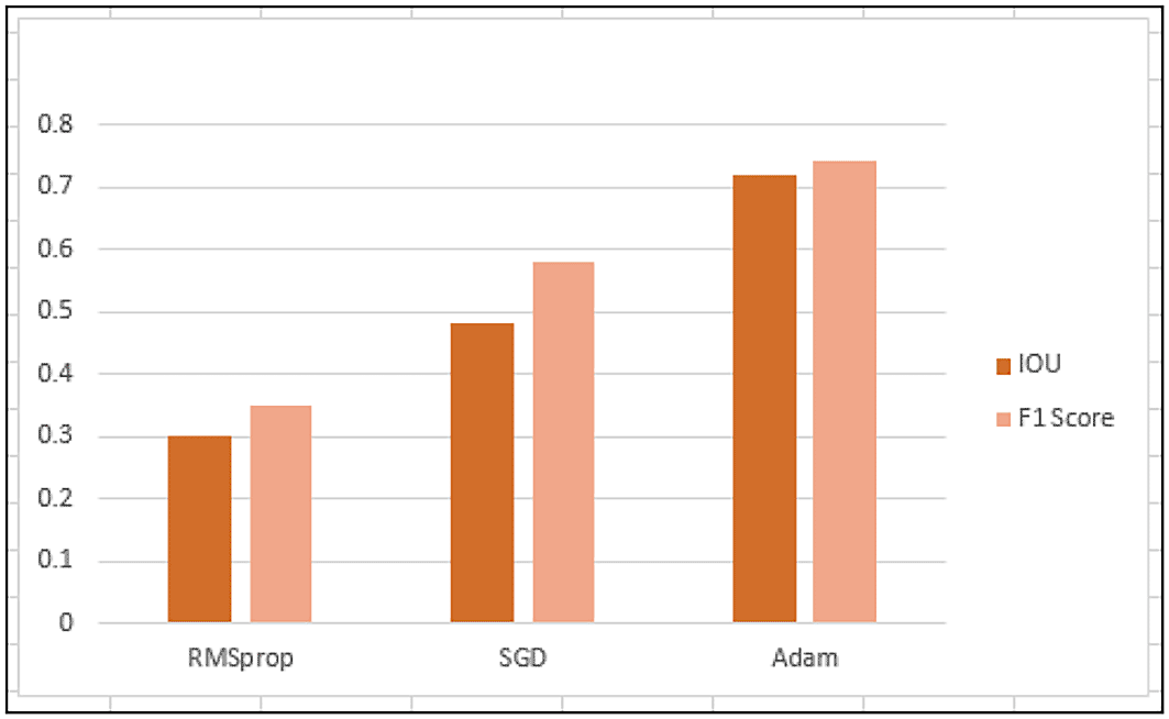 The optimizer plays an important role in identifying the segmented regions. Various optimizer were analyzed based on the performance of the SSAE method. First the U-Net optimizer known as RMSprop was used where the overlapping region was not clear with an IOU of 0.3 and a F1 Score of 0.35. The second optimizer identified was SGD (stochastic gradient descent), where the IOU was 0.48 and the F1 Score was 0.58. Finally, the best overlap occurs when the Adam optimizer was executed with an IOU of 0.72 and the F1 Score of 0.74 (Figure 5).