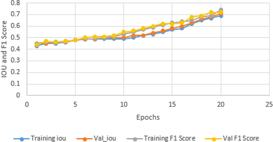 The F1 Score is another method used to evaluate the pixel classification performance. The training and validation F1 Score was compared with those of epochs and graphical illustrations are presented in Figure 8.