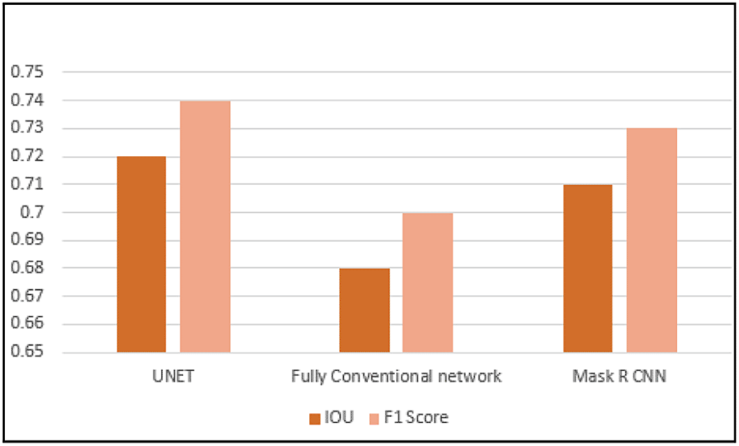 Among all other architecture, structural similarity between pathological and annotated images was implemented with higher performance using U-Net with an IOU of 0.72 and F1 score of 0.74, where the fully conventional network contains an IOU of 0.68 and an F1 score of 0.74. In addition, the performance of Mask RCNN obtains an IOU of 0.71 and an F1 score of 0.73. A graphical representation of performance analysis of the various architectures is illustrated in Figure 9.
