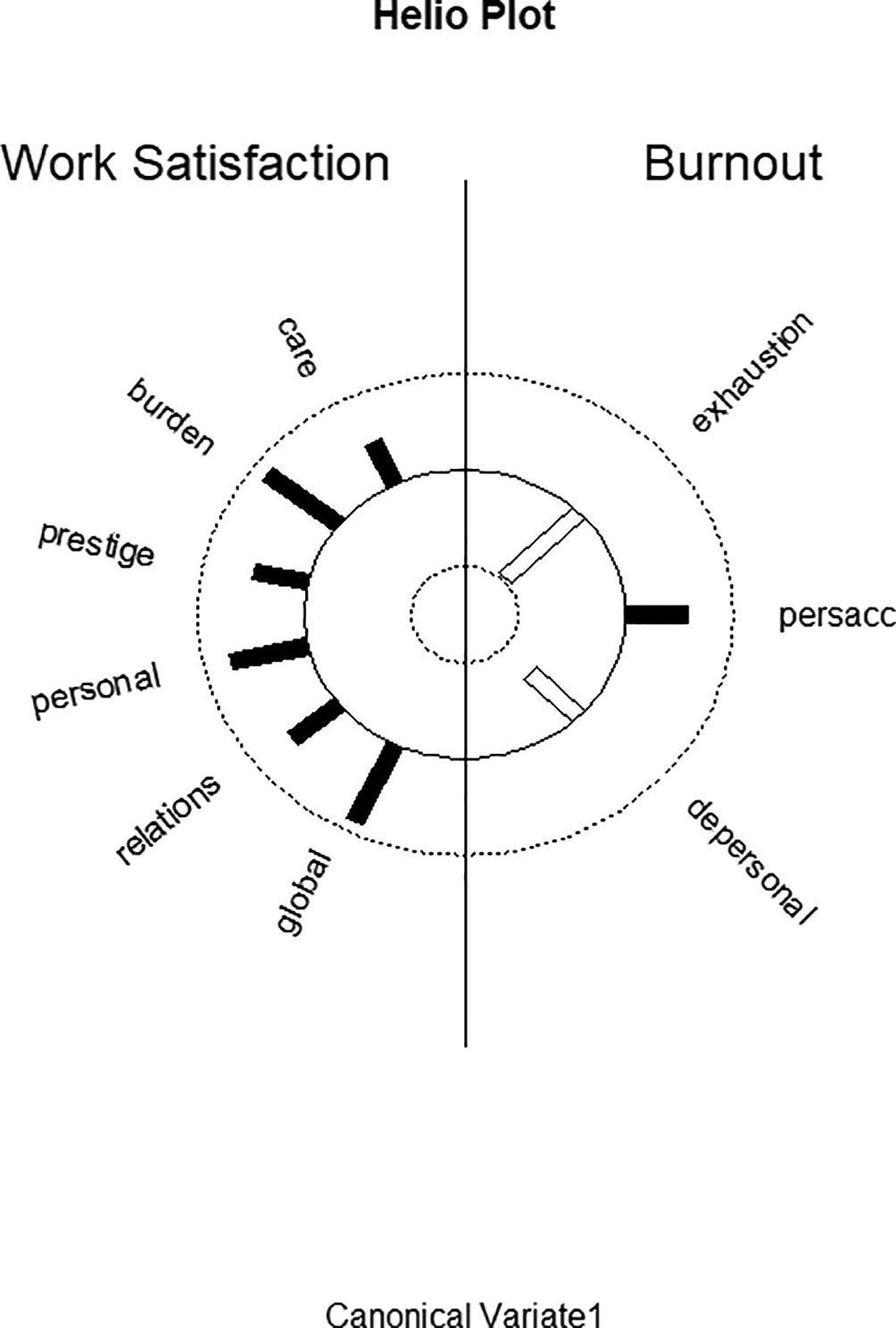Function 2 Patient care and professional relations seem to be good predictors for personal accomplishment. The predictor canonical variate is characterized by patient care and professional relations and the above-mentioned cross-loading of income/prestige (Table 4). The second criterion canonical variate is characterized mainly by personal accomplishment (r = .76), which explains 57% of the variance of this variate (Table 5). Figure 2 displays the structure correlations (loadings) of the WSQ scales on the second predictor canonical variate and of the structure correlations (loadings) of the MBI scales on the second criterion canonical variate. It visualizes the differential loading patterns and associations between job satisfaction and burnout variables in function 2. In relation to the other variables there is also a higher loading of personal relations, but this WSQ scale has a higher loading on the first predictor canonical variate.