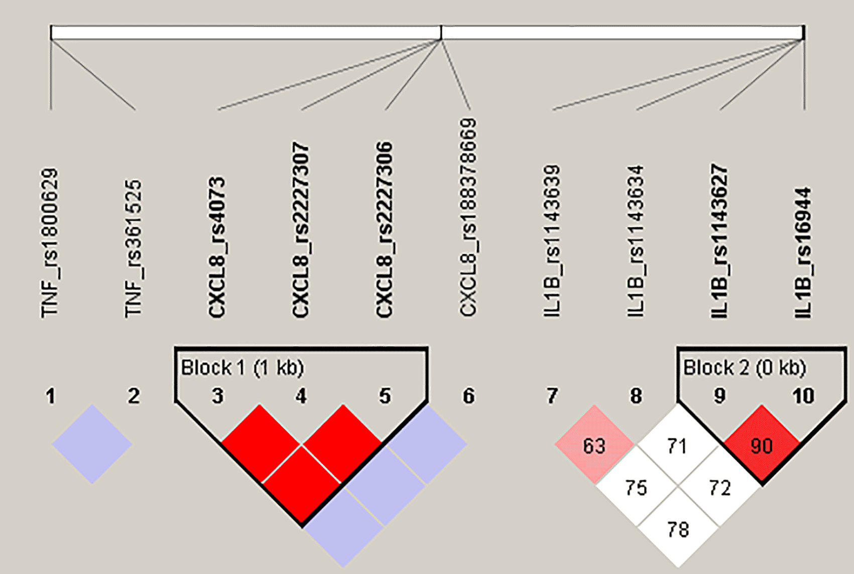 Conformance of genotypes distribution of all analyzed polymorphisms with the Hardy-Weinberg equilibrium (HWE) was assessed using Fisher’s exact test. The pair-wise linkage disequilibrium (LD) of variants located in genes TNF, CXCL8, and IL1B was evaluated by Lewontin’s D′ using Haploview software version 4.2. The correlation analyses between genotypes and clinical data were performed using the chi-square test and Fisher’s exact test.