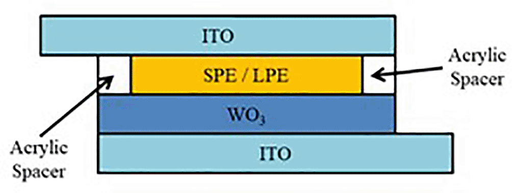 The device structure for both SECD and LECD is presented in Figure 1. Sol-gel deposited WO3 films are used as the EC layer and ITO coated glasses are used as the conductive electrodes. The SPE and LPE are sandwiched in between the ECD using an acrylic spacer. To explain further, the WO3 films are the colour changing layer, ITO coated glasses conduct electricity across the ECDs and the SPE and LPE supplies the necessary ions for ECD operation.