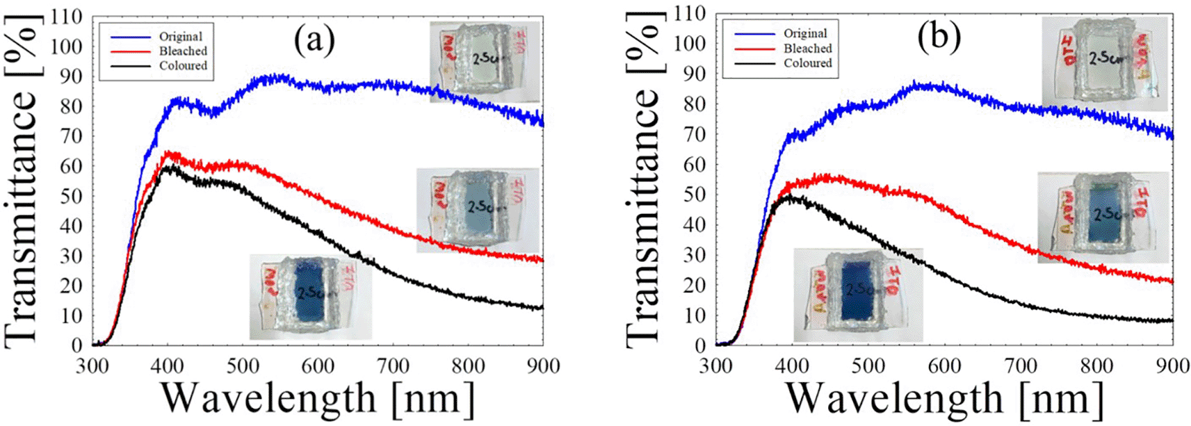 In terms of optical properties, the original, coloured and bleached transmittance of SECD and LECD are recorded in Figure 3(a) and 3(b) respectively, under wavelengths between 280 nm and 900 nm as well as its corresponding colour change of the physical ECDs.