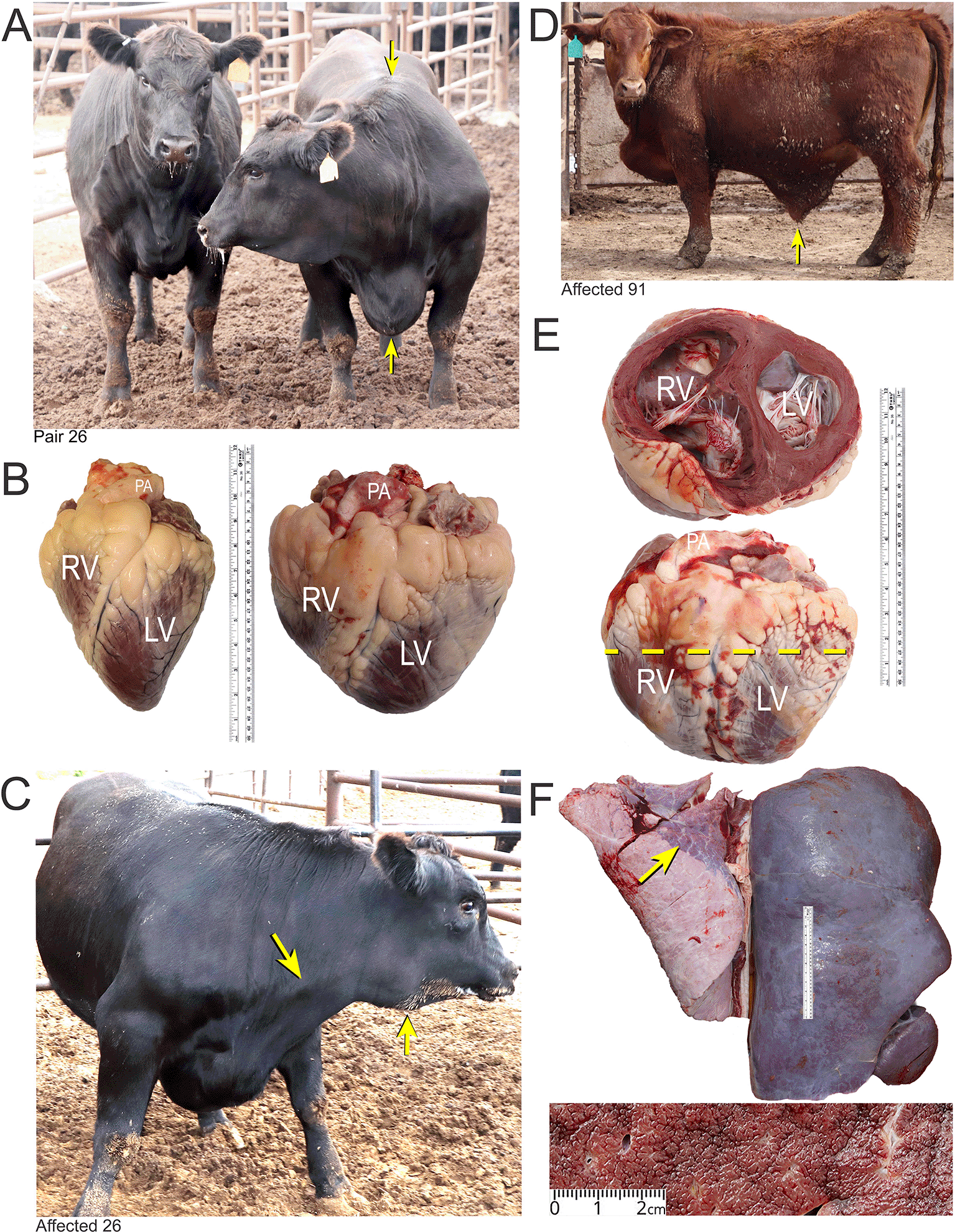 Panel A, matched pair number 26 with the clinical case (right) showing ventral edema and a drop in the withers (arrows). The latter occurs as the fluid accumulates in thorax pushing the shoulders outward. Panel B, the affected heart of case 26 (right) compared with a normal heart of a fattened American Angus heifer. Abbreviations: RV, right ventricle; LV, left ventricle; PA, pulmonary artery. Panel C, PA distension and mandibular edema in case 26 (arrows). Panel D and E, clinical case number 91 with ascites (arrow) and enlarged heart with dilated RV. Panel F, Enlarged, encapsulated liver of case 91 with “nutmeg liver” appearance in cross section due to hepatic venous congestion, and atelectasis in lungs (arrow).