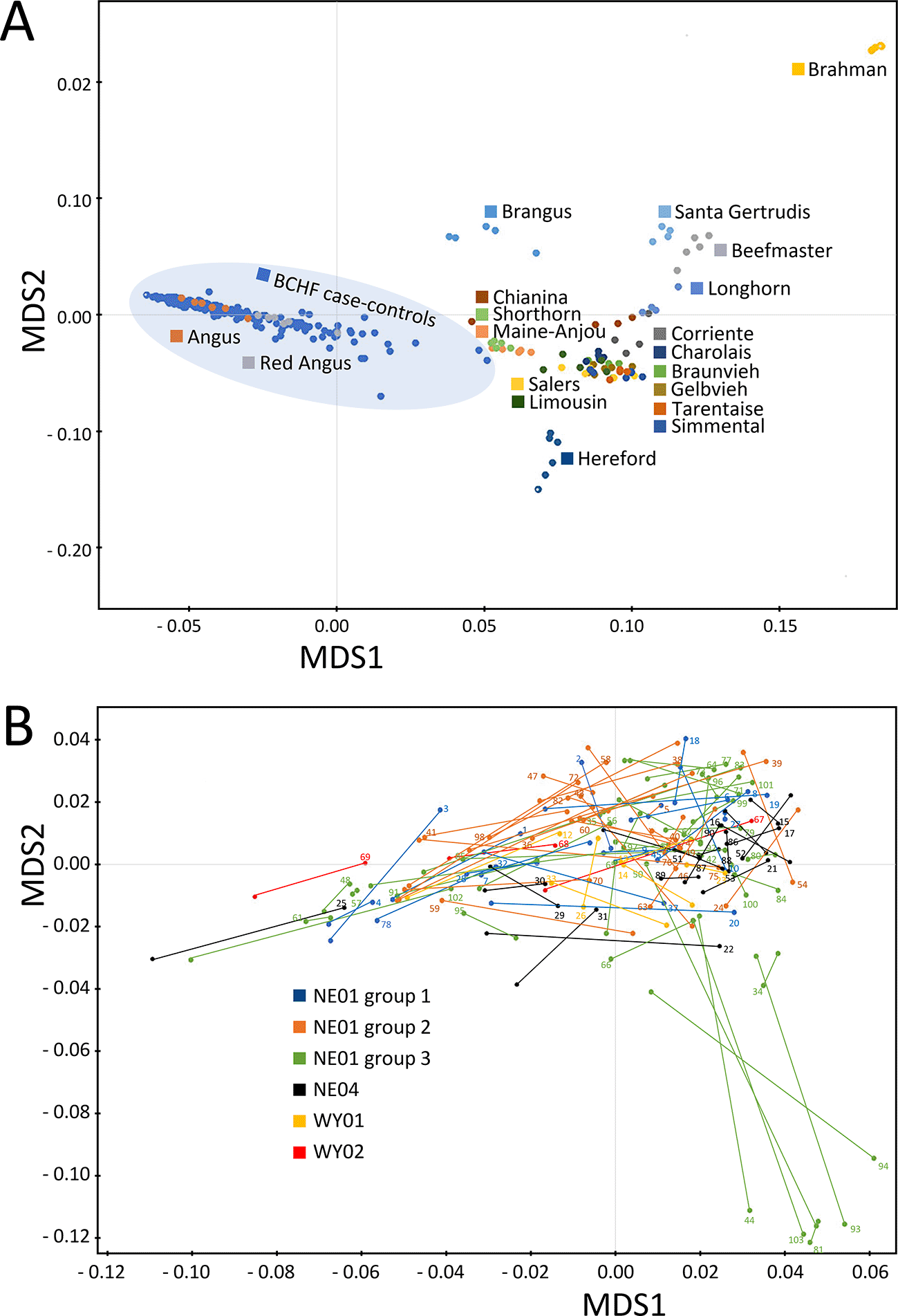 Panel A, genetic distances between BCHF case-control animals and diverse purebred bulls from 19 U.S. beef breeds. Panel B, genetic distances between matched pair from different feedlot groups and locations in Nebraska (NE) and Wyoming (WY). Lines connecting dots identify each matched pair with numbers corresponding to the pair ID (Table S1) and the clinical case.