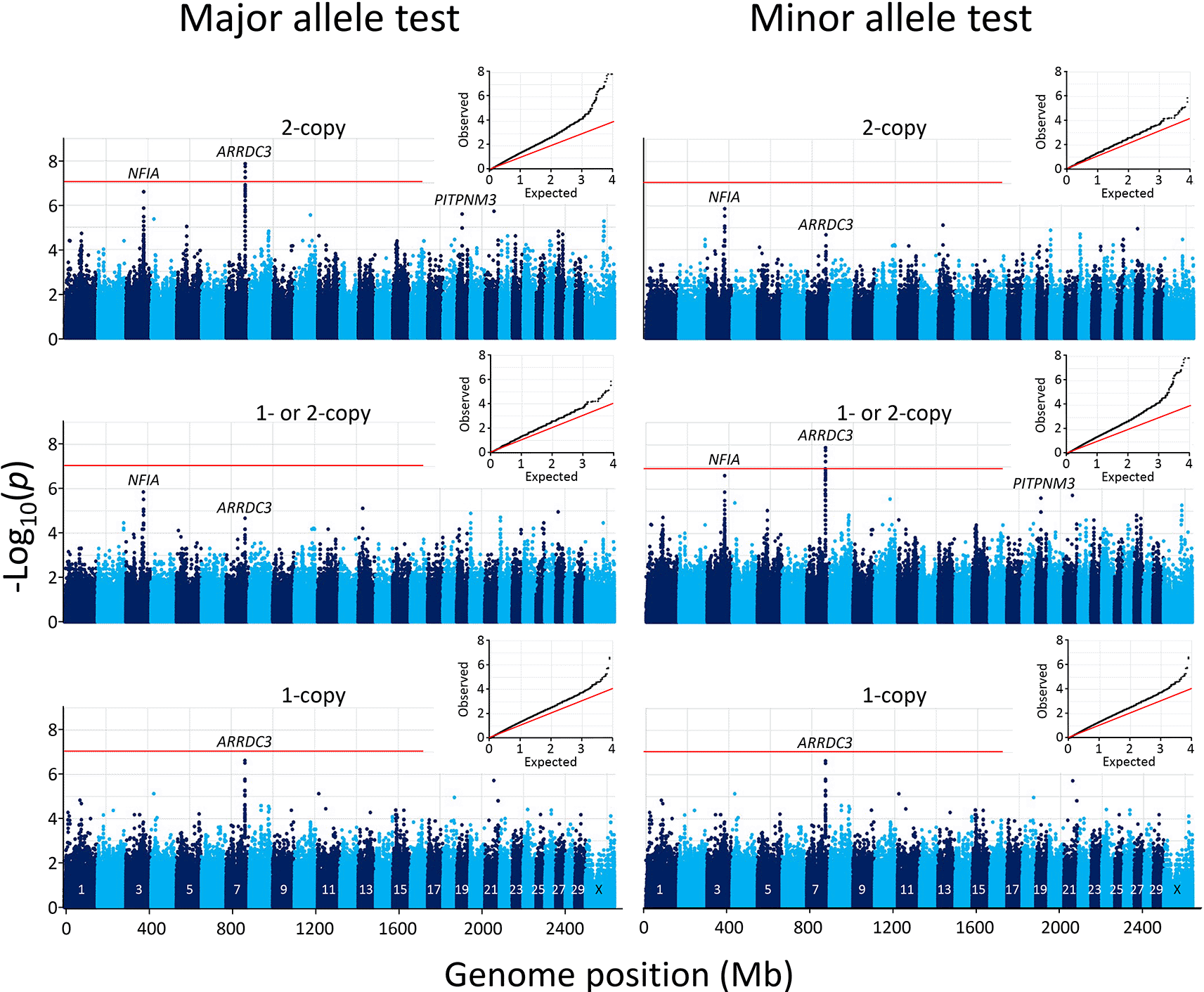 The mid-p-values from the McNemar’s association test were used with major (left) and minor alleles (right). In both panels, the inset shows the Q-Q plot of the distribution of the test statistics and the red horizontal line shows the Bonferroni correction at an α of 0.05.