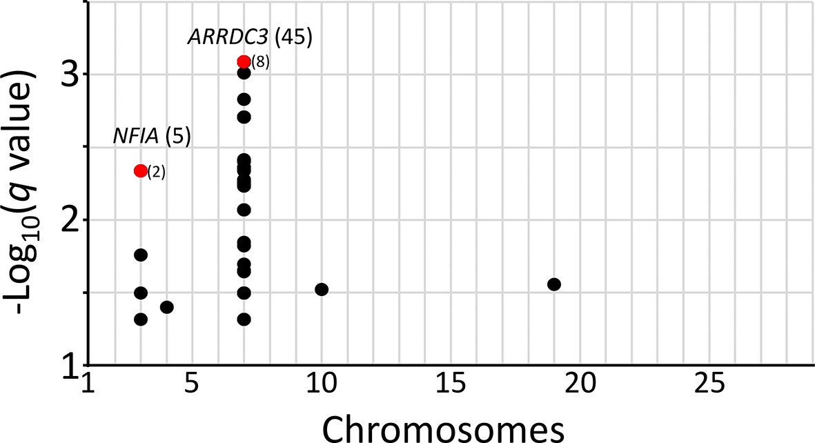 While the Bonferroni correction protects against Type I errors (false positives), it is vulnerable to Type II errors (false negatives). To strike a balance between the number of true and false positives, q-values were calculated for the McNemar data set to identify regions surpassing a 5% FDR. The q-value threshold is the expected proportion of significant SNP associations that are false leads. There were 53 genome-wide autosomal SNPs passing the 5% FDR: 49 were associated with ARRDC3 on chromosome 7, five were associated with NFIA on chromosome 3, and one SNP each was associated with a region on chromosomes 4, 10, and 19 (Figure 4, File S13 Extended data). Since the three SNPs on chromosomes 4, 10, and 19 correspond to the expected proportion of false leads, these regions were dismissed for the purposes of the present study. The remaining genomic regions associated with ARRDC3 and NFIA genes were further characterized.