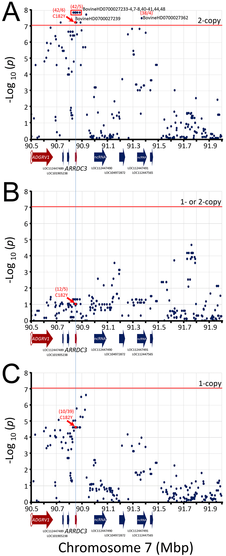 The choice of which ARRDC3 and NFIA markers are best for genetic testing is based on results presented in Table 2. In the ARRDC3 gene region, there are eight perfectly linked SNPs (r2 = 1.0, Figure S2, Extended data) that have the highest statistical association with BCHF and flank the C182Y missense mutation (BovineHD0700027239). The linkage of C182Y with these eight SNPs and a proximal ninth SNP is nearly perfect (r2 = 0.91 and 0.95, respectively). However, the difference in the OR based on informative pairs between the flanking SNPs and C182Y is within the margin of error (b/c = 42/5 and 42/6, respectively). Thus, any of the nine linked SNPs can be used as a proxy for the C182Y SNP in exon 4, which is hypothesized here as the disease-causing site when Y182 is homozygous. In the NFIA gene region, there are two tightly linked SNPs in intron 2 (r2 = 0.94) that have the highest statistical association with BCHF, and a third SNP in NFIA antisense (AS) 2 region (r2 = 0.49 and 0.45, respectively). The difference in the OR between the NFIA intron 2 SNPs and the NFIA AS2 SNP was not insignificant (b/c = 37/5 and 41/11, respectively). Thus, we recommend using either of the NFIA intron 2 SNPs for genotyping (BovineHD0300024307, BovineHD0300024308).