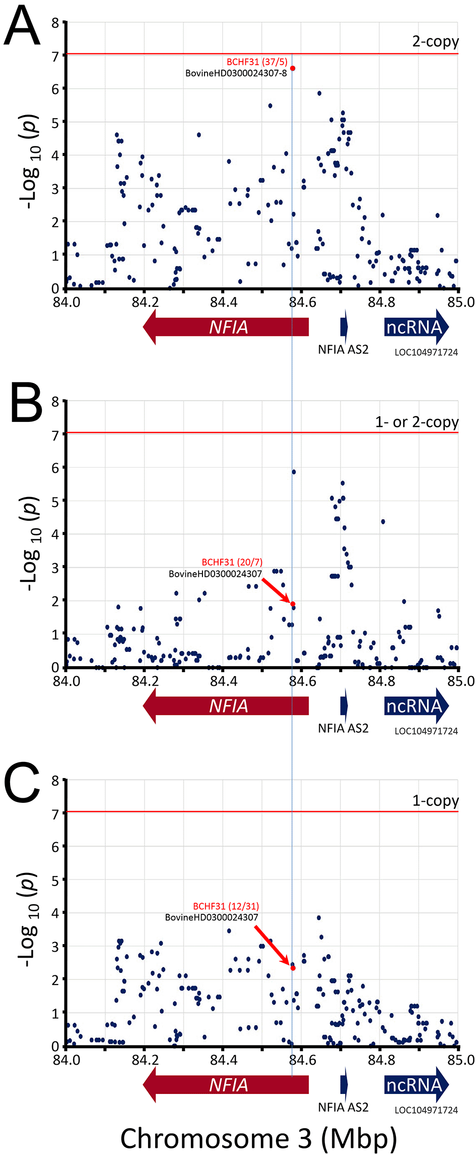 c Note that the LD is only moderate (r2 ~ 0.47) between BCHF2 (BovineHD0300024366) and the SNPs most associated NFIA: BCHF31 (BovineHD0300024307), and BCHF32 (BovineHD0300024308). Thus, the BCHF2 allele values in this table are rough estimates of those for BCHF31 and BCHF32.