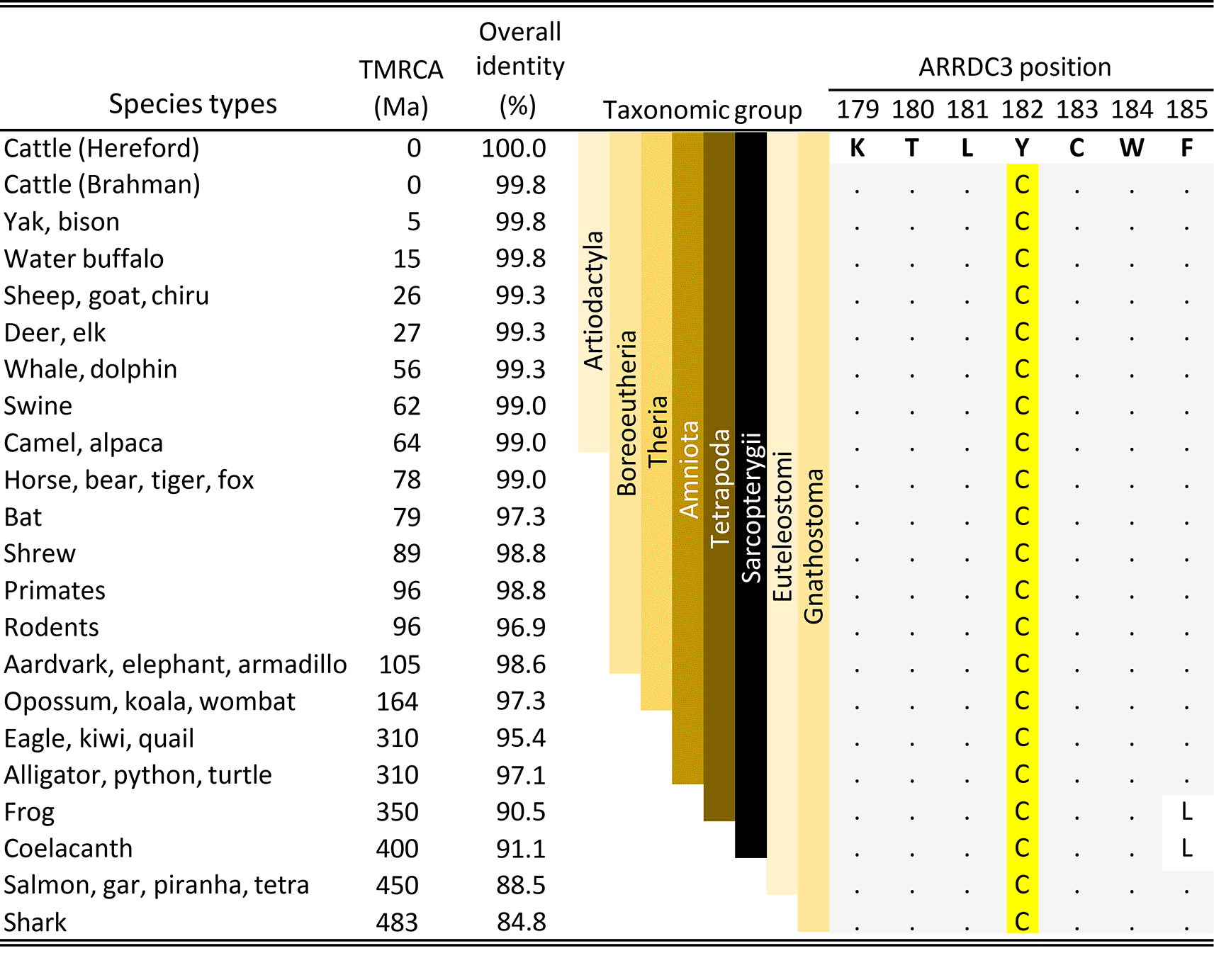 The association of a missense variant in ARRDC3 with BCHF raised the possibility that the amino acid substitution could affect protein function and thereby increase the risk of disease in feedlot cattle. A comparison with ARRDC3 codons at position 182 in the jawed-vertebrate species (Gnathostomes) showed that cysteine residues were invariant throughout the 41 representative species examined (Figure 7). Examples of Gnathostome species with alternative residues at the equivalent position were not observed in any genus. The conservation of the C182 residue throughout the Gnathostomes is consistent with the hypothesis that the C182 residue is critical for normal ARRDC3 protein function and that homozygosity of the B. taurus-specific Y182 variant may have a deleterious effect.