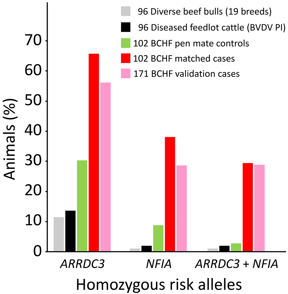 A custom two-SNP test was designed on a commercially available platform to genotype cattle for the major ARRDC3 and NFIA risk alleles. The platform uses “padlock” oligonucleotide probes, combined with fluorescently labeled probes and isothermal rolling circle amplification technology, for the qualitative detection of alleles. Using reference DNA from animals with known genotypes, the call rate and accuracy typically exceeded 97% and 99%, respectively. This included repeated testing of approximately 10% of the samples due to ambiguous allele calls on the first pass. Using custom genotypes to resolve errors in the original BovineHD BeadChip array, the BCHF OR for calves with homozygous risk alleles at both genes increased to 28-fold more (b/c = 28/1, p-value = 1.1 × 10-7, CI95 = 4-206). Testing an independent set of 171 BCHF cases from the same feedlots showed approximately 29% were homozygous for both ARRDC3 and NFIA risk alleles, compared to 29% of the BCHF 102 cases used in the GWAS (Figure 8). Conversely, an independent set of feedlot cattle persistently infected with BVDV had about 2% homozygosity for both ARRDC3 and NFIA risk alleles, which was similar to the 3% observed with the 102 unaffected animals used in the GWAS. Assuming a 5% BCHF prevalence in the most severely affected pens of feedlot cattle, the adjusted negative and positive predictive values were 0.99 and 0.10, respectively, with a sensitivity and specificity of 0.91 and 0.58. Thus, genetic testing with two SNPs has significant power to identify which animals have the least genetic predisposition for developing BCHF in feedlots, while having less power to predict which animals will develop disease. ARRDC3 and NFIA genotype configurations and their corresponding expected disease and allele transmission risks, together with their allele frequency estimates by breed, are presented in Tables 3 and 4, respectively. Although imperfect, these genetic associations and DNA tests provide a starting point for reducing BCHF risk in the most affected herds.