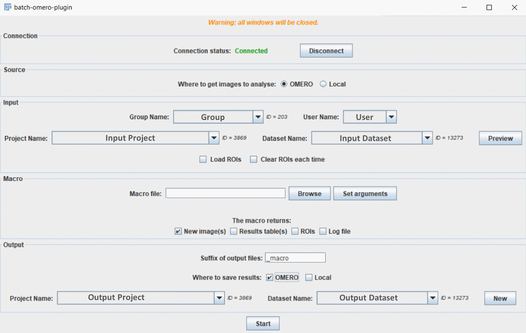 The tool can process images retrieved remotely from OMERO or locally from a folder, using Bio-Formats. Conversely, it can save the output on OMERO and/or locally. The main possible outputs are new images, ROIs, results tables, log windows and the user has to specify (Figure 1) what should be saved in accordance with the outputs of the macro.