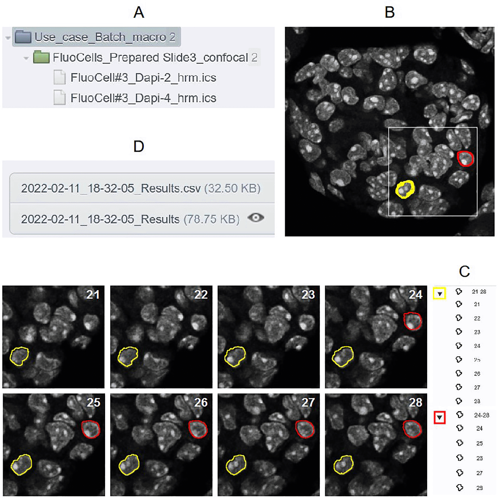 As 2D or 3D segmentation is a general requirement to perform quantification in cellular biology, a use case based on this image analysis procedure is proposed to show all the possible outputs obtained with these tools. So, the batch OMERO plugin and OMERO Macro extensions were tested on a XYZ set of DAPI images obtained from a FluoCells Prepared Slide 3 (mouse kidney section with Alexa Fluor 488 WGA, Alexa Fluor 568 Phalloidin, and DAPI) from ThermoFisher Scientific. Images were acquired on a LSM780 laser scanning confocal (Carl Zeiss, France) through a 63X/1.4 oil immersion objective (excitation 405nm, emission 430-460nm, voxel size 130x130x200nm) and a blind deconvolution was applied using Huygens Remote Manager with a CMLE algorithm (Scientific Volume Imaging, Netherlands). Two macros are available to try the Batch OMERO plugin: