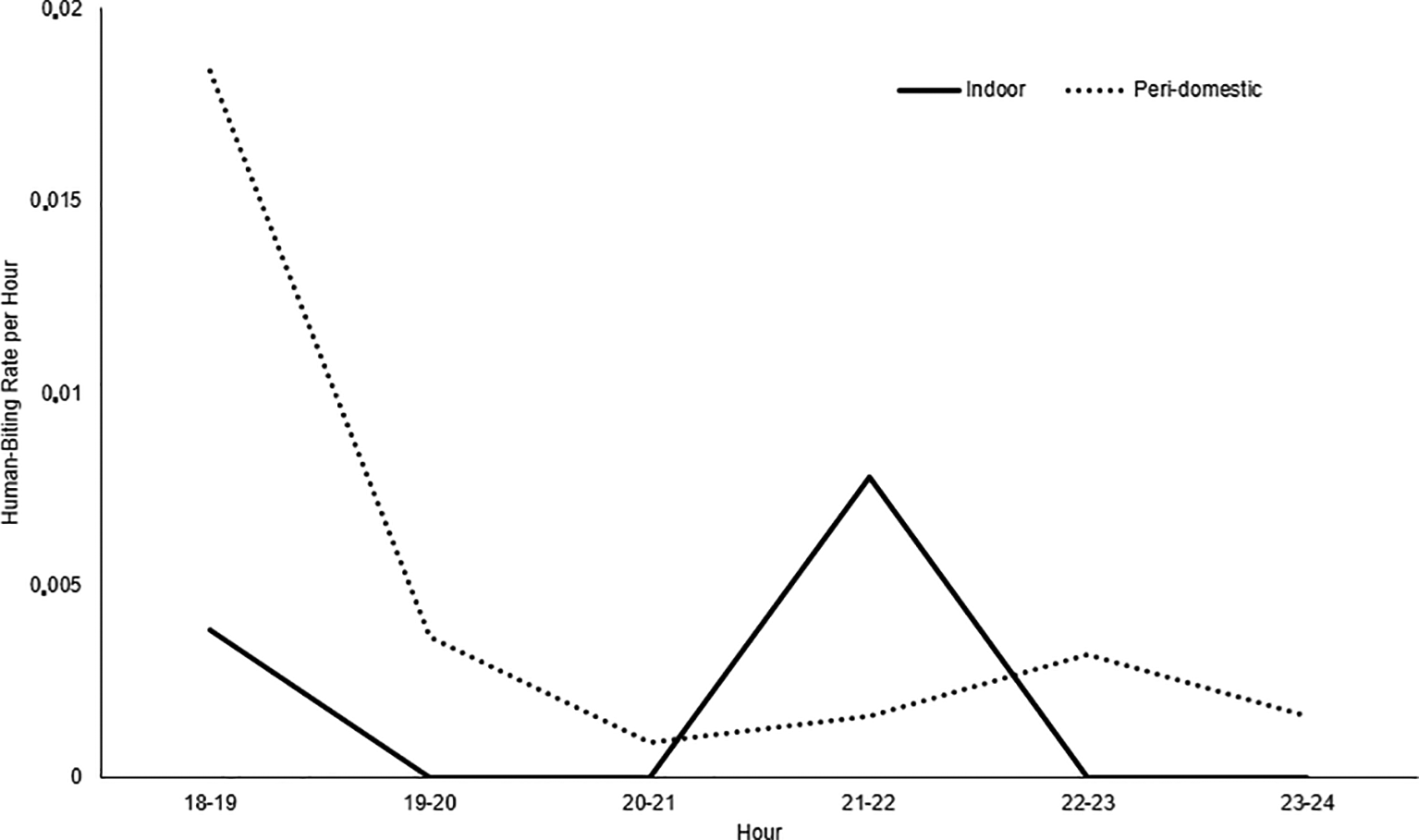 37 Anopheles mosquitoes belonging to the albimanus species were collected. The highest number of mosquitoes was identified in the Los Ángeles and Candamo neighborhoods. No malaria vector mosquitoes were identified in the Nuevo Milenio and Once de Noviembre neighborhoods. Between 18:00 and 19:00 hours, the highest activity occurred in the peri-domestic area, with a 0.018 human-biting rate (HBR) per hour and indoor between 21:00 and 22:00 hours, with a 0.007 HBR (Figure 2). The average human biting rate (HBR) at night was 0.74 and the HBR was 0.06 for all studied areas.