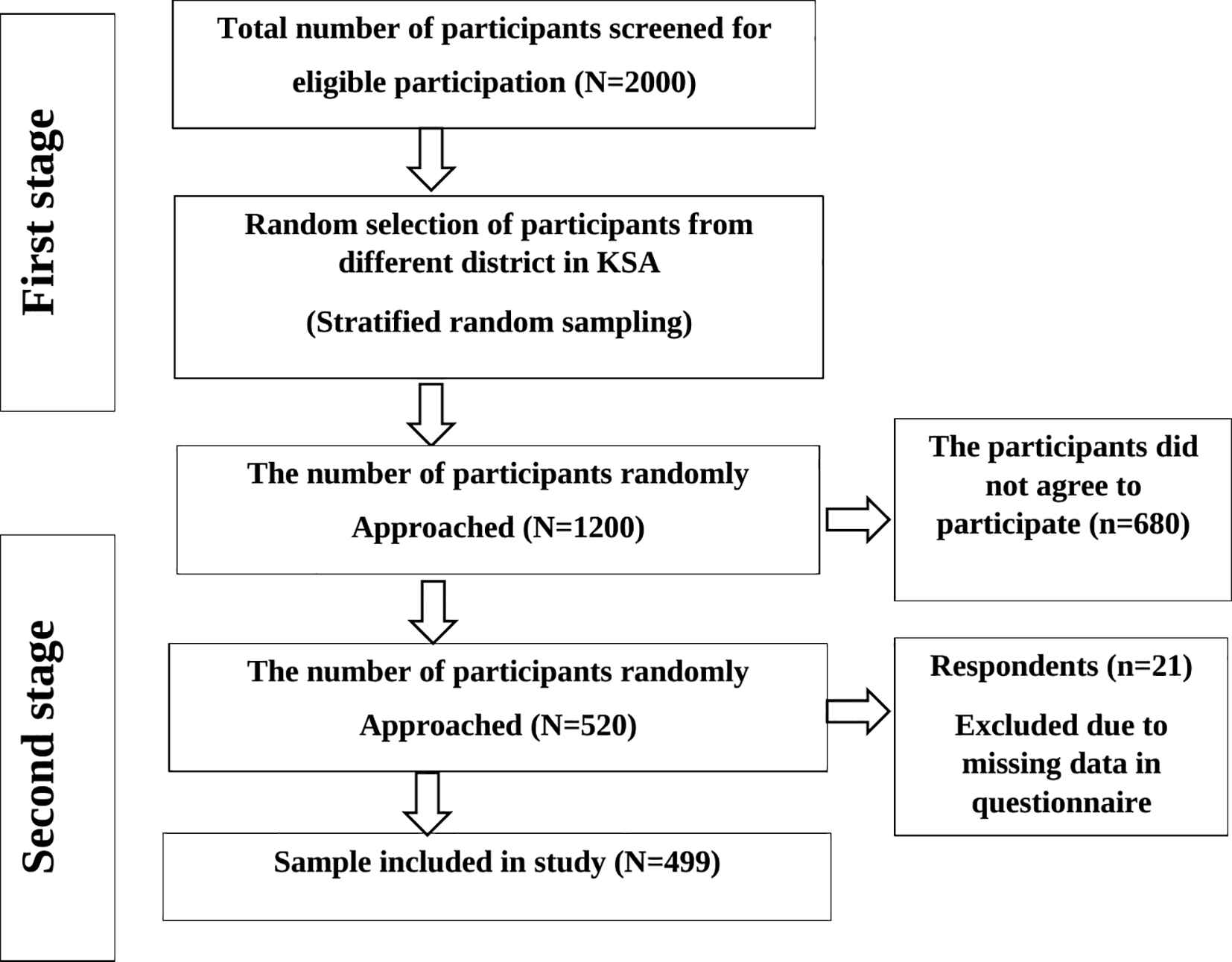 The required sample size was calculated using Raosoft sample size calculator (Raosoft, Inc., Seattle, WA, USA), with a confidence interval of 99%, a response rate of 70%, and a margin error of 5%. The sample size was 1200 participants. A two-stage sampling approach was employed to select participants, with a random sampling of participants from different district followed by a random selection of participants from those districts. During the first sampling stage, random selection was conducted on a list of patients in the hospital database and 520 patients returned the questionnaire. 21 respondents were excluded because of missing data. Finally, 499 respondents were included in this study (Figure 1).