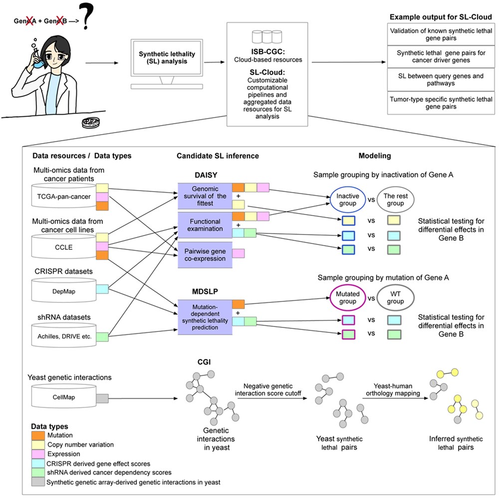 Schematic overview of the computational workflows and data resources aggregated in this framework to facilitate investigation of synthetic lethal interactions. Users with specific research questions (top-left) reuse inference workflows from the provided scientific computing notebooks to query public cancer genomics datasets from the vast resources provided by the ISB-CGC and additional datasets pre-processed in SL-Cloud. Three candidate synthetic lethal pair inference workflows were implemented, including the DAta-minIng SYnthetic lethality identification (DAISY), mutation-dependent synthetic lethality prediction (MDSLP), and conserved genetic interaction (CGI) workflows. Different data resources and data types were used for different inference workflows. For example, the DAISY and MDSLP workflows rely on statistical testing over the multiple omics data and functional screening data such as CRISPR and shRNA datasets for human cancers, whereas the CGI workflow is based on an ortholog mapping of the SL interactions identified in yeast.