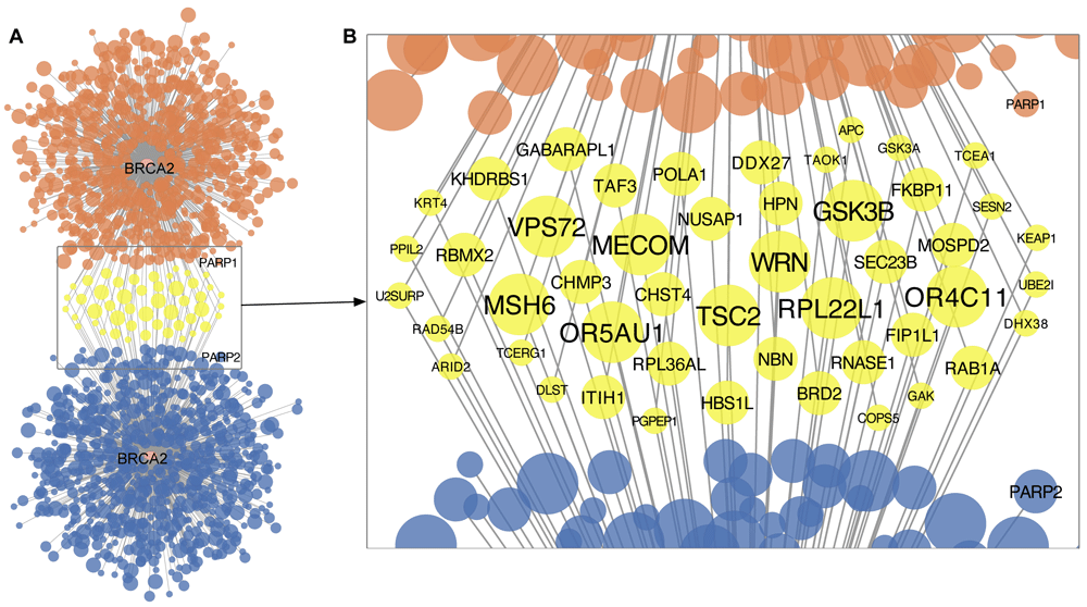 A. Network-based representation of predictions generated by the mutation-dependent synthetic lethality prediction (MDSLP) using either shRNA (upper panel, orange) or CRISPR (lower panel, blue) functional screening datasets. B. Potential synthetic lethal partners of BRCA2 as predicted by both the CRISPR and shRNA functional screening data. Each node represents a gene, and edges represent potential synthetic lethal interactions. The node color encodes overlap between the gene-dependency assay type, with yellow representing synthetic lethal pairs predicted in both the CRISPR data and the shRNA functional screening data. The node size and font size indicate the strength of the statistical relationship, with high-confidence pairs having larger node sizes or font sizes. FDR levels: < 0.01 (largest), < 0.05 (median), and <0.1 (smallest).