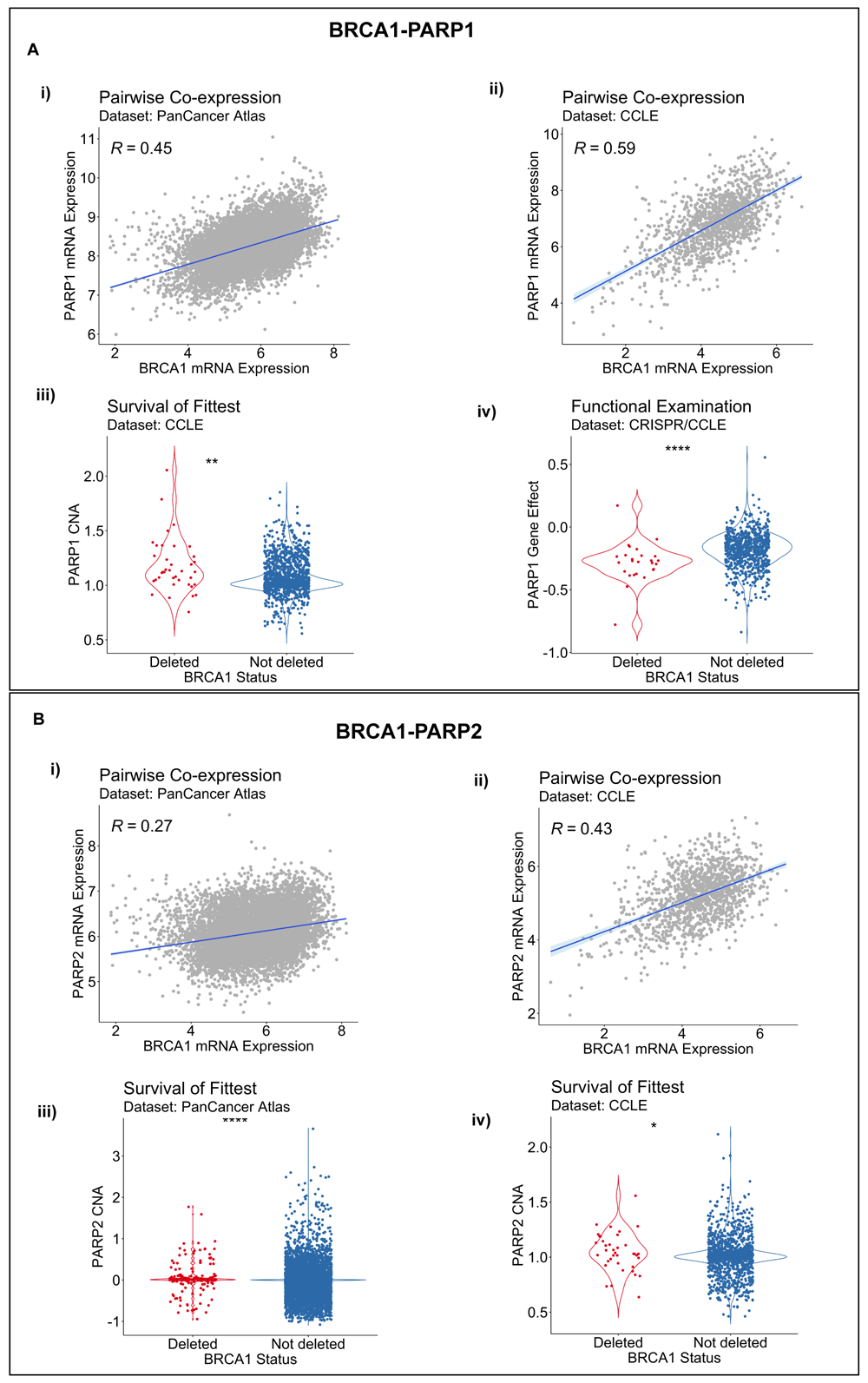 A. Evidence for a BRCA1-PARP1 synthetic lethal relationship by pairwise co-expression in i) Pan-Cancer Atlas and ii) CCLE datasets respectively; iii) by survival of the fittest in in CCLE data; and iv) by functional examination in DepMap CRISPR. B. Evidence for a BRCA1-PARP2 SL relationship by pairwise co-expression in i) Pan-Cancer Atlas and ii) CCLE datasets and by survival of the fittest in iii) Pan-Cancer Atlas and iv) CCLE datasets. R, Spearman correlation coefficient; p, P value by the one-sided Wilcoxon rank-sum test; * P < 0.05; ** P <0.01; **** P < 0.0001.