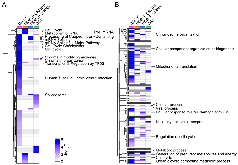 Heatmaps depicting A. the KEGG or REACTOME pathway and B. Gene Ontology Biological Process (GOBP) enrichment for predictions made using four different approaches (columns). Increasing color intensity represents increasing statistical significance (P < 0.05, calculated by a hypergeometric test) for enrichment. Pathways or GOBPs were labeled if they were enriched by synthetic lethal partner genes identified by at least two prediction approaches. The redundant GOBPs were further reduced by REVIGO. The 398 GOBPs enriched by at least one approach were reduced to 172 GOBPs based on their semantic similarities, and then summarized into 27 representative groups whose enrichment significance is represented in the heatmap. Clustering analysis was performed for GOBPs inside and outside of the 27 representative groups, separately. The red line down the left side of panel B indicates the separation between the clustering analyses. DAISY, data mining synthetic lethality identification workflow; MDSLP-CRISPR, mutation-dependent synthetic lethality prediction workflow with CRISPR; MDSLP-shRNA, mutation-dependent synthetic lethality prediction workflow with shRNA; CGI, conserved synthetic lethal interactions from yeast screens.