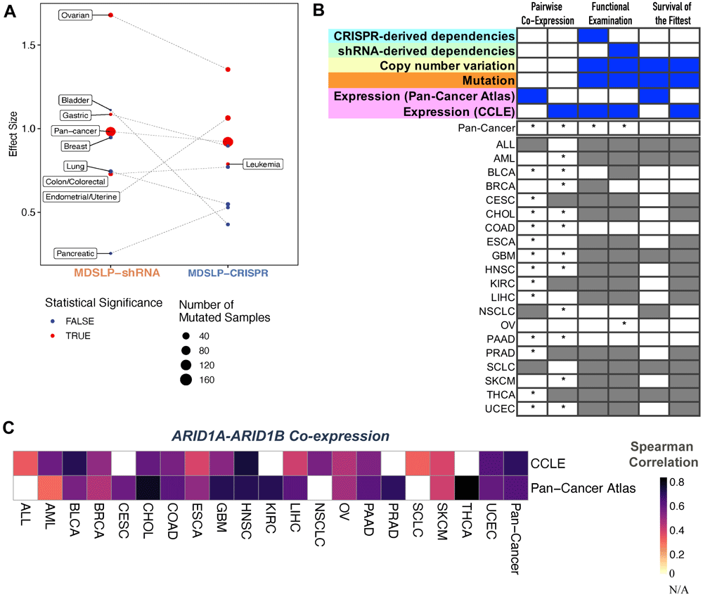 A. Evidence for synthetic lethality generated from the mutation-dependent synthetic lethality prediction (MDSLP) workflow as applied to cancer cell line dependency datasets when comparing the gene dependency scores (effects) for the shRNA and CRISPR datasets between the ARID1A-mutated group and wild-type group for different cancer types and across all cell lines (pan-cancer analysis). The threshold for statistical significance is FDR < 0.05. B. Statistical evidence for a synthetic lethal relationship between ARID1A and ARID1B from the DAta mIning SYnthetic lethality identification workflow (DAISY), with the results for each inference module being represented in the columns. Column heatmaps summarize the datasets used for each procedure. An asterisk (*) indicates that a test passed the FDR threshold (0.05); gray shading represents an invalid test or a lack of data availability. Gray shading represents an invalid test. C. Heatmap visualization depicting the Spearman correlation between ARID1A and ARID1B for the annotated cancer type for a patient derived sample (Pan-Cancer Atlas) or cancer cell line (CCLE) (rows) across different cancer types (columns).