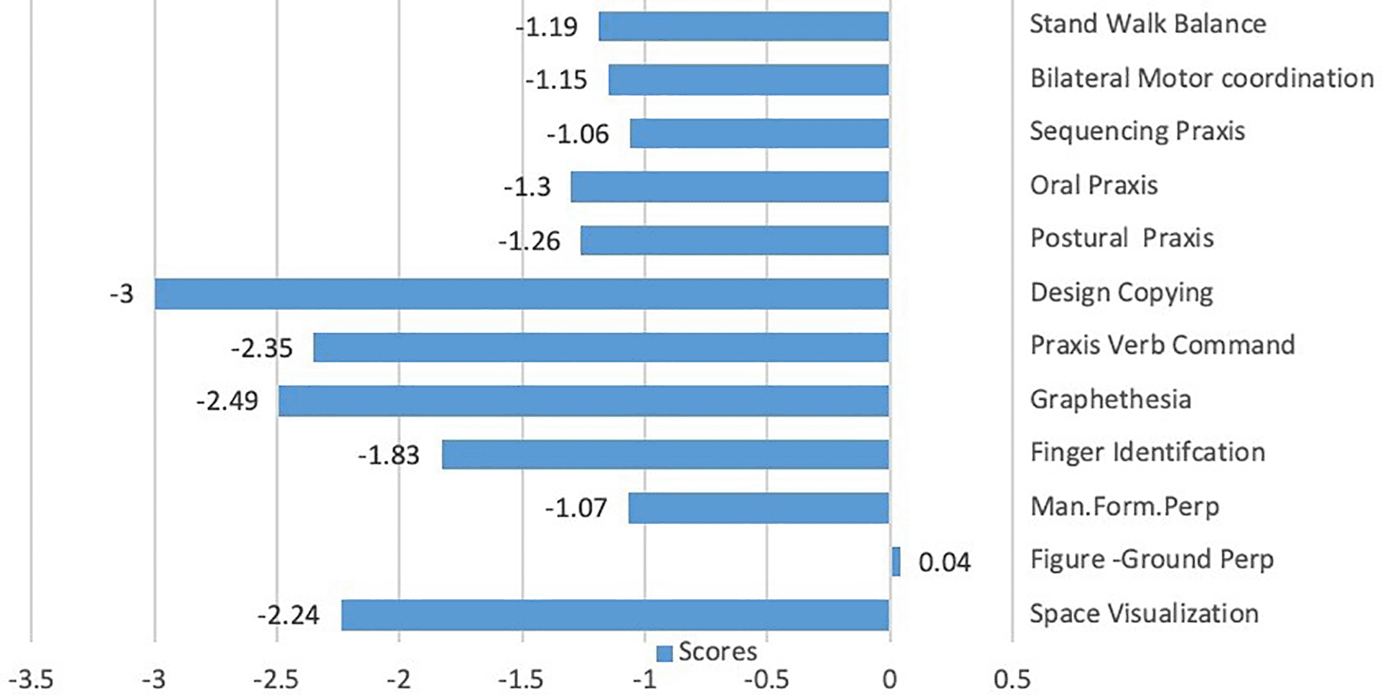 L attempted 13 of the 17 SIPTs, completing 12 (see Figure 1). Scores indicated difficulty with tactile and kinesthetic processing, especially manual form perception, finger identification, and graphesthesia. L struggled in motor planning as measured by postural praxis, oral praxis, sequencing praxis, design copy, and bilateral motor coordination. Similarly, she scored low for space visualization. L was unable to participate in the localization of tactile stimuli, kinesthesis, and constructional praxis tests, and unable to fully participate in motor accuracy and postrotary nystagmus tests.