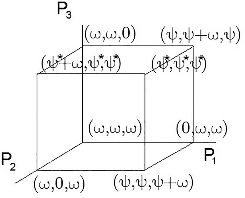 All possible solutions are limited within the multidimensional cube of situations. Such visualization is applicable to the three-dimensional case considered in this example and is used solely for clarity. In the case of , this can be visualized in Figure 1. At the cube corners, the economic indicators associated with externalities are marked.