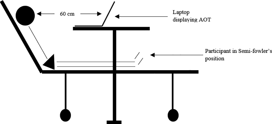 Demographic characteristics and stroke-specific clinical parameters like LL voluntary control (VC) according to Brunnstrom grading14 and Fugl Meyer Assessment for LL (FMA-LE) scores15 of all participants were recorded. The AOT videos were viewed on a laptop with a 15.5-inch screen. The participants were positioned comfortably in semi fowler’s position so that the monitor was visible clearly (Figure 1). Proper lighting and noise-free environment were ensured at all times. Participants observed side appropriate videos (corresponding to their more-affected side) on bed mobility and in-bed transitions (gait prerequisite domain).