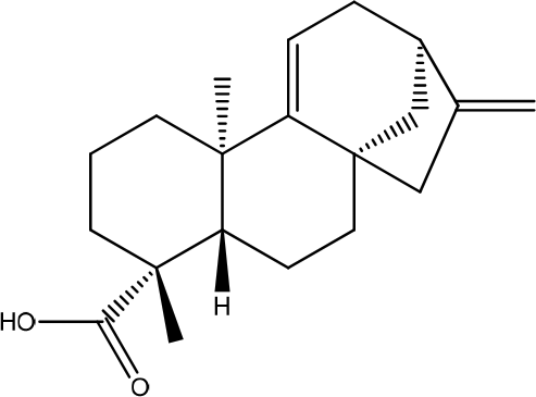 Grandiflorenic acid from Wedelia trilobata leaves was assessed for its possible activity on HaCaT keratinocyte proliferation and its effects on in vitro scratch tests, collagen content, TGF-β2 levels, and nitric oxide, TNF- and IL-1β determinations using Raw 264.7 cells. Grandiflorenic acid (2,5 g/mL) resulted in a 106% percentage of HaCaT keratinocyte viability, induced a migration rate of 100% in the initial in vitro assay, and the collagen content increased to 171,2 g/mL compared to control (61,1μg/mL) with human fibroblasts. Grandiflorenic acid has potential wound-healing activity due to fibroblast stimulation and inhibition of prolongation of the inflammatory phase of wound-healing, as evidenced by a decrease in inflammatory cytokine levels from Raw 264.7 macrophage cells. Grandiflorenic acid and proteoglycans increased collagen production (Figure 12).12