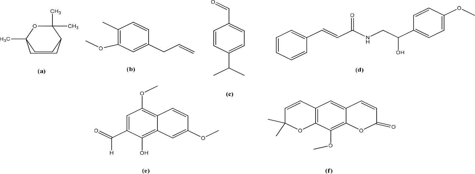 The active compounds isolated from Maja flower (Aegle marmelos L.) are cineol, eugenol, cuminaldehyde, aegelin, 1-hydroxy-5, 7-dimethoxy-2 naphthalene-carboxaldehyde (HDNC), and Luvangetin, which had been purified >98% (Figure 13). Treatment with Maja flowers for 24 hours drastically increases cell motility and expression of keratinocytes in specific cell lines. It enhances protein expression in loricrin, filaggrin, and involucrin (a keratinocyte differentiation marker). Keratinocyte motility is enhanced by the ERK and Akt signaling pathways.32