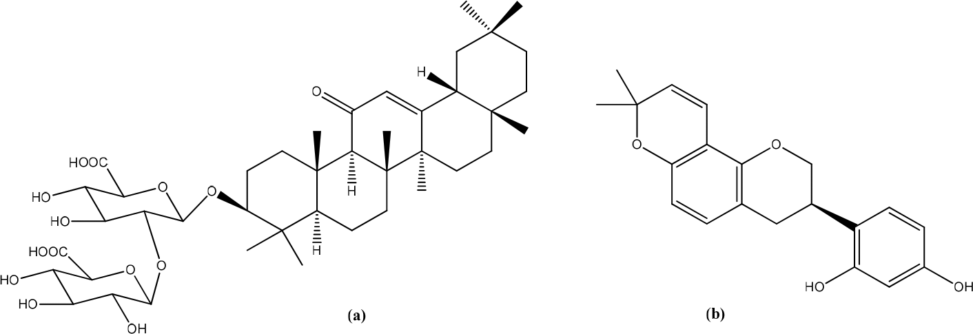 Glycyrrhiza glabra (GG) has a positive proliferative effect on keratinocytes. The larger the dose, the higher the rate of proliferation. GG inhibits abnormal cell proliferation and is anticarcinogenic. Although GG has been shown to increase the rate of cell proliferation and migration of keratinocytes and promote wound-healing, the underlying mechanism is unclear. However, GG helps activate proliferation and cytoskeletal rearrangement proteins and promotes wound-healing. The antioxidant effect of some GG constituents, such as glycyrrhizin and glabridin, may also help enhance the wound-healing ability of keratinocytes (Figure 15).35