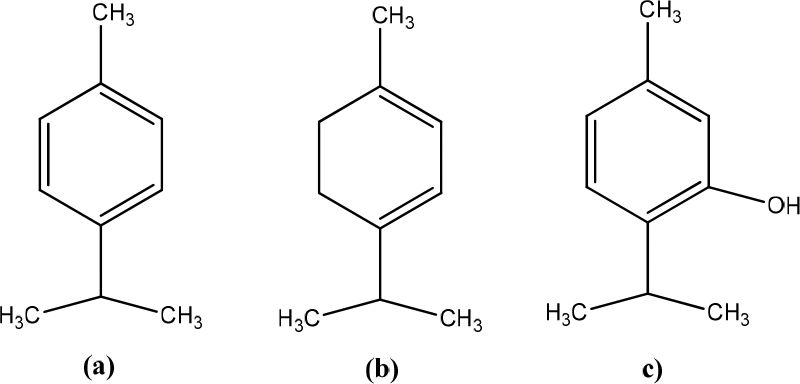 Previous studies showed that Thyme oleoresin at 25 g/mL and 50 g/mL significantly promoted HaCaT cell migration, leading to wound closure. The upper part of the plant is reported to have significant components such as p-cymene, α -terpinene, and thymol (Figure 17). Possible mechanisms in wound-healing are its ability to maintain wound moisture, wound-healing, increase oxygenation by increasing blood supply, increase epithelial cell migration, rapid maturation of collagen and reduce inflammation, increase collagen synthesis, increase the synthesis of hyaluronic acid and dermatan sulfate in wound tissue.38
