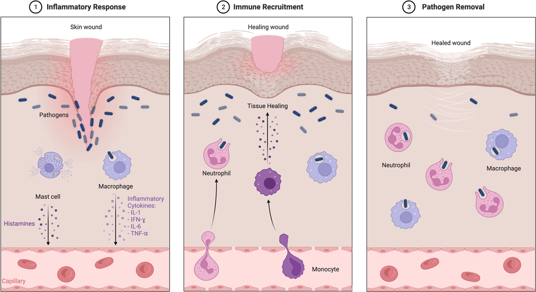2. Inflammatory phase, The flow of inflammatory cells to the wound site for protection against pathogens and activates skin cells. During this phase, neutrophils and macrophages are activated by releasing pro-inflammatory cytokines such as IL-1𝛽, IL-6, IL-8, and TNF, and growth factors such as PDGF, TGF-𝛼, TGF-𝛽, IGF-1, and FGF (Figure 2).9