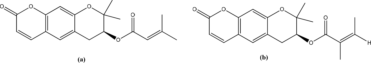 Angelica gigas contains Coumarin, decursin, and decursinol angelate (Figure 24). This extract improves wound-healing with HaCaT human keratinocytes. ERK1/2 phosphorylation is essential for cell survival, proliferation, and inhibition of apoptosis. The expression of genes encoding ECM remodeling proteins, inflammatory cytokines, and growth factors is an essential step in human wound-healing. The simultaneous expression of these genes can accelerate this process.44
