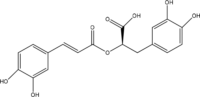 Salvia haenkei contains rosmarinic acid (Figure 25). Hydroalcoholic extract of S. haenkei effectively increases the wound closure rate in cultured keratinocytes with the almost total invasion of the scrapes after 48 h of treatment. Gene expression analysis showed that S. haenkei regulates the nuclear factor-κB (NF-κB) transcription factor signaling pathway positively. The results showed that the S. haenkei extract does not cause a statistically significant increase in the rate of fibroblast migration. Specifically, this study analyzed the mRNA levels of several genes involved in the early inflammatory phase of skin repairs, such as the transcriptionally active subunit of the transcription factor NF-κB (RelA), the inflammatory cytokine interleukin-6 (IL-6), and tumor necrosis factor-alpha. (TNF-α), inducible nitric oxide synthase (iNOS or NOS2), and the inducible prostaglandin synthesis enzyme cyclooxygenase-2 (COX-2). Tn with S. haenkei increases the IL-6 in fibroblasts and keratinocytes (83.6 and 19.7-fold induction, respectively), whereas TNFα levels only have a mild increasing trend.11