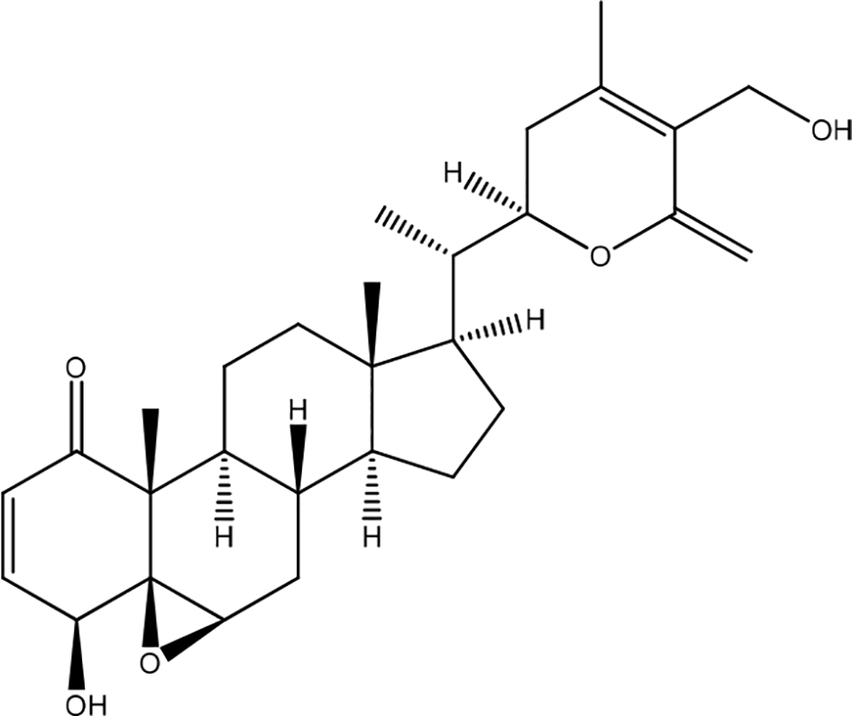 Withania somnifera contains withaferin A which has anti-inflammatory, antiangiogenic, antimetastatic, and anticancer activities (Figure 27). The results showed that ashwagandha extract (AE) significantly inhibited mRNA expression of inflammatory cytokines, including interleukin IL-8, IL-6, TNF-α, IL-1β, IL-12, and promoted mRNA expression of the anti-inflammatory cytokine TGF-β1 in HaCaT cells. In addition, AE inhibited lipopolysaccharide-induced phosphorylation of p38 and c-Jun N-terminal kinase, as well as NF-κB p65. The results showed that EA was not toxic to HaCaT cells up to a dose of 10 mg/mL. AE inhibits the MAPK/NF-κB pathway. The NF-κB and MAPK signaling pathways are strongly associated with the expression of inflammatory cytokines in HaCaT cells.16