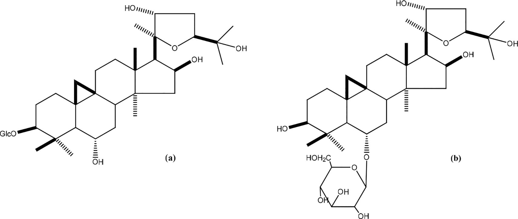 Astragaloside VI (AS-VI) and cycloastragenol-6-O-beta-D-glucoside (CMG) (Figure 32) enhance skin cell proliferation and migration via activation of the EGFR/ERK signaling pathway, resulting in enhanced wound-healing in vitro. AS-VI actively promotes the proliferation of human keratinocytes (HaCaT) by activating the ERK1/2 pathway rather than the JNK and p38 pathways. This plant shows that astragaloside can activate cellular processes involved in wound-healing. It is mediated, at least in part, by EGFR/ERK1/2, which could be beneficial in wound closure.49