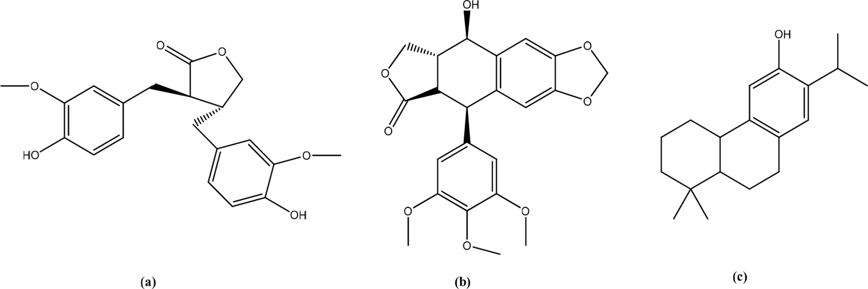 Fitzroya cupressoides, commonly called allerce, contain fatty acids, mono and sesquiterpenes, diterpenes, lignans, and phytosterols. Diterpenes and lignans were the most active compounds, with the biomolecules matairesinol, podophyllotoxin, and ferruginol (Figure 34). Allerce extract has a significant effect on wound-healing. The results showed that the extract stimulated cell division in human skin epidermal cells in the context of wound repair. These results also indicated that allerce extract accelerated the healing process after 24 and 48 h of treatment. This effect was promoted principally by stimulating HaCaT cell division in the context of wound repair.51