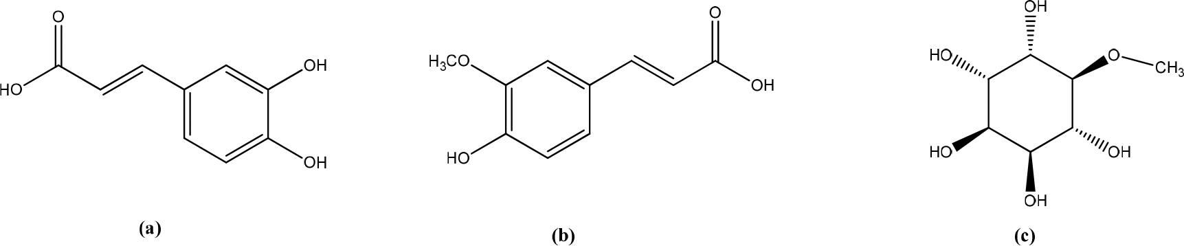 The methanol extract (EM) of the leaves of Boerhavia diffusa significantly increased the viability and migration of human keratinocytes (HaCaT) cells. GC-MS analysis revealed the presence of caffeic acid, ferulic acid, and D-pinitol as the primary bioactive metabolites (Figure 4). The content of secondary metabolites in the extract of punarvana such as phenolics and flavonoids reduces lipid peroxidation, increases collagen fibrils’ survival by increasing collagen fibers’ strength, prevents cell damage, and accelerates DNA synthesis. Phenolics, flavonoids, and terpenoids enhance wound-healing due to their antioxidant and antimicrobial properties. Antioxidants enhance the healing process by reducing the damage caused by free oxygen radicals. D-pinitol, which is an insulinomimetic. Apply topical insulin promotes diabetic wound-healing by regulating wound inflammatory cells and improving cellular function. Bioactive insulin activates the IR/IRS/PI3K/AKT pathway involved in skin wound-healing, leading to tissue regeneration and growth, proliferation, and migration of keratinocytes and fibroblasts. In addition, caffeic and ferulic acids can promote wound-healing mainly due to their potent antioxidant and anti-inflammatory properties.22