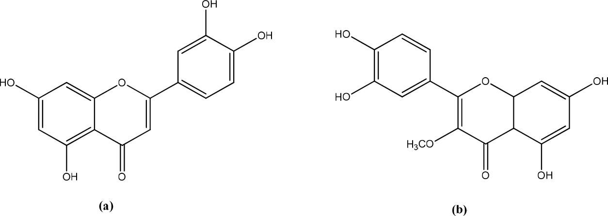 Achyrocline satureioides (Lam.) extracts are medicinal plants originating from Brazil, Uruguay, Argentina, and Paraguay. This plant contains quercetin, luteolin and 3-O-methylquercetin (Figure 5).23 The results showed a significant increase in the viability of HaCaT cells on ASE-loaded nanoemulsions (NEASE) (up to 5 g/mL of flavonoids). Preliminary tests showed that NEASE was able to increase cell migration at low flavonoid concentrations. ASE did not induce HaCaT cytotoxicity and tended to increase keratinocyte cell viability compared to controls after 24 h of treatment for all concentrations tested (0.625-10 g/mL).24