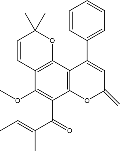 Anti-inflammatory and wound-healing activities have been reported of calophyllolide (CP) isolated from Calophyllum inophyllum Linn (Figure 6). The results showed that CP did not affect the viability of HaCaT cells in the concentration range. CP reduced fibrosis formation and effectively promoted wound closure in a mouse model without causing weight loss. The molecular mechanisms underlying wound repair reduce MPO activity and increase M2 macrophages. CP prevents a prolonged inflammatory process by downregulating pro-inflammatory cytokines-IL-1β, IL-6, TNF-α, but upregulating anti-inflammatory cytokines, IL-10.25