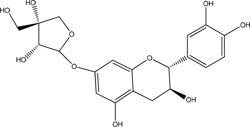 The bark of Ulmus parvifolia contains phenolic compounds and steroid glucosides, used to treat edema. This plant has been isolated containing catechin-7-O-β-D-apiofuranoside (Figure 7).26 The results showed that HaCaT cells grown in the presence of U. parvifolia root bark extract showed a faster and dose-dependent growth rate than untreated cells. Collagen protein remodeling during wound-healing may be affected by proteolytic activity in the extracellular matrix by matrix metalloproteinases (MMPs). MMPs play an essential role in all stages of wound-healing during normal tissue remodeling and morphogenesis by modifying the wound matrix. Understanding the role of MMPs during infection and chronic tissue repair could pave the way in identifying potential targets for chronic wounds. In addition, MMPs also regulate cell-cell and cell-matrix signaling by releasing cytokines and growth factors sequestered in the extracellular matrix (ECM). TGF-β is a family of growth factors that play an essential role in wound-healing by regulating the inflammatory response, keratinocyte proliferation and migration, angiogenesis, collagen synthesis, and ECM remodeling.3