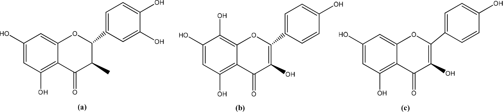 Hibiscus syriacus (HS) contains flavonoids (dihydroquercetin, herbacetin, and kaempferol) (Figure 9). HS ethanol extract accelerated wound-healing activity in epithelial formation and fibronectin production. In addition, HS enhances the expression of genes involved in skin hydration and homeostasis. HS contains compounds that can stimulate the expression of biomarkers relevant to skin regeneration and hydration, thereby counteracting the molecular pathways that cause skin damage and aging. Fibroblasts and keratinocytes are the keys to the wound-healing process in the skin. Treatment of HaCaT cells with 0,002% HS for 24 hours significantly improved the wound-healing response. Wound repair at 0,002 and 0,01% HS increased by 50 and 20%, respectively. Aquaporin 3 (Aqp3) is an integral membrane pore protein expressed more in the basal than in the upper layers of the epidermis. Specifically, the Aqp3 and filaggrin genes were increased by 20 and 58%, respectively. Aqp3 selectively conducts water molecules in and out of cells and prevents the passage of ions and other solutes. Filaggrin is a filament-associated protein that binds to keratin fibers and is responsible for the integrity and waterproofing capacity of the top layer of skin.13