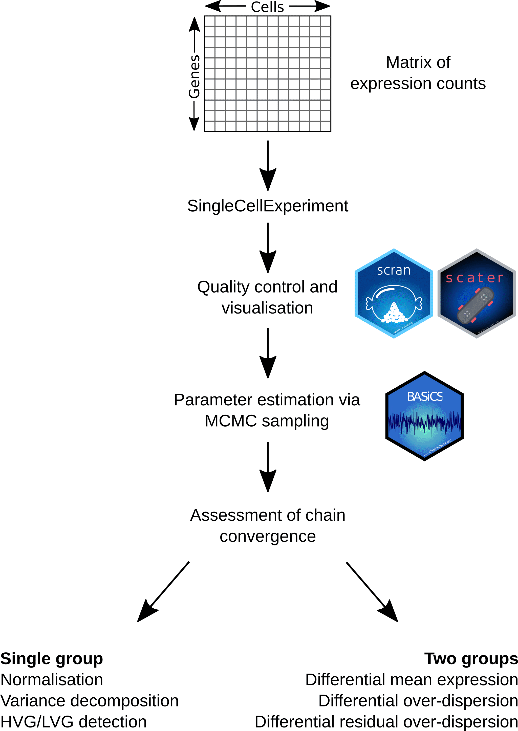 Starting from a matrix of expression counts, we use the scater and scran Bioconductor packages to perform QC and initial exploratory analyses. To robustly quantify transcriptional heterogeneity within seemingly homogeneous cell populations, we apply the BASiCS Bioconductor package and illustrate how BASiCS can be used to analyse a single or multiple pre-specified groups of cells.