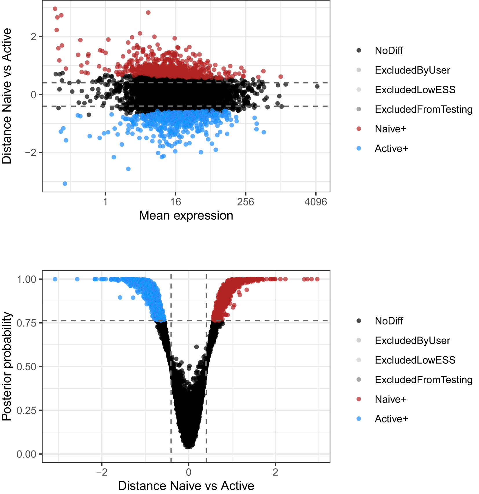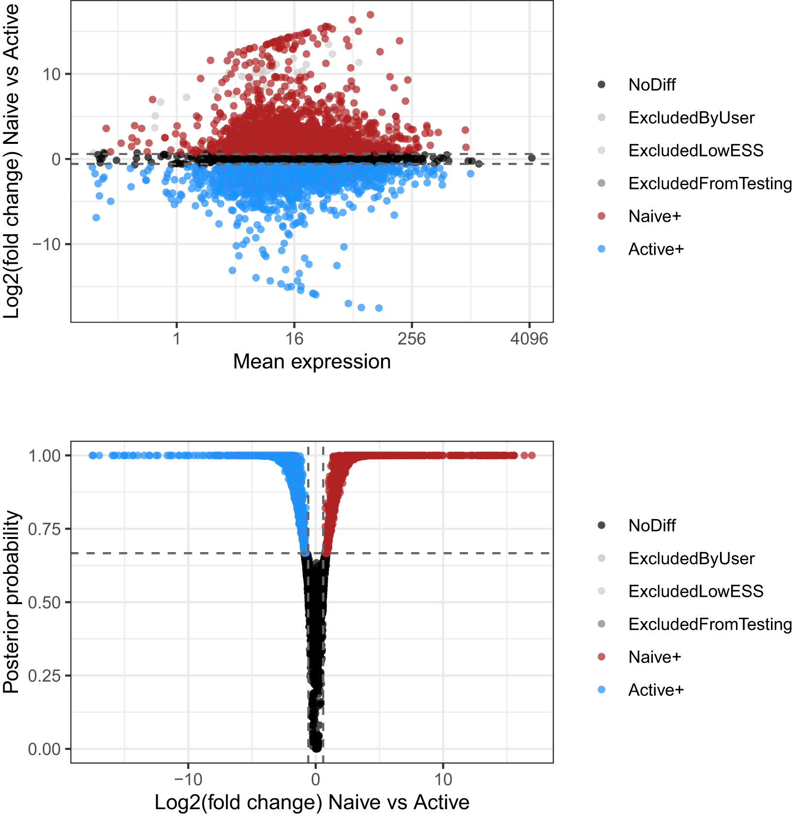 Log-fold changes of average expression in naive cells relative to active cells are plotted against average expression estimates combined across both groups of cells. Bottom panel presents the volcano plot associated to the same test. Log-fold changes of average expression in naive cells relative to active cells are plotted against their associated tail posterior probabilities. Colour indicates the differential expression status for each gene, including a label to identify genes that were excluded from differential expression test due to low effective sample size.